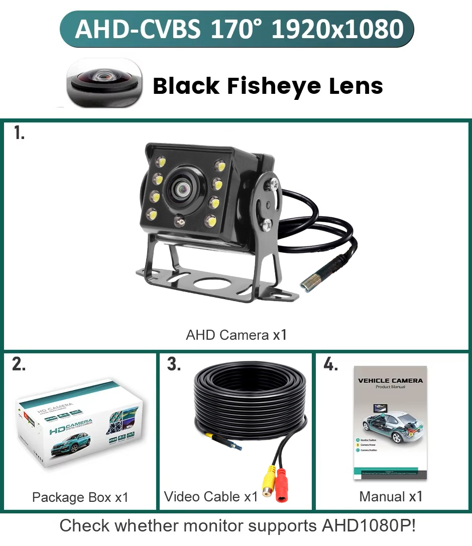 Câmera traseira AHD para caravana, camião e autocarro, com ângulo de visão de 170º e com lente olho de peixe.