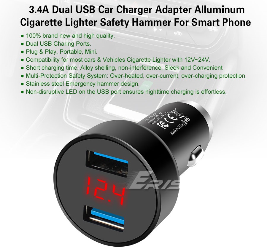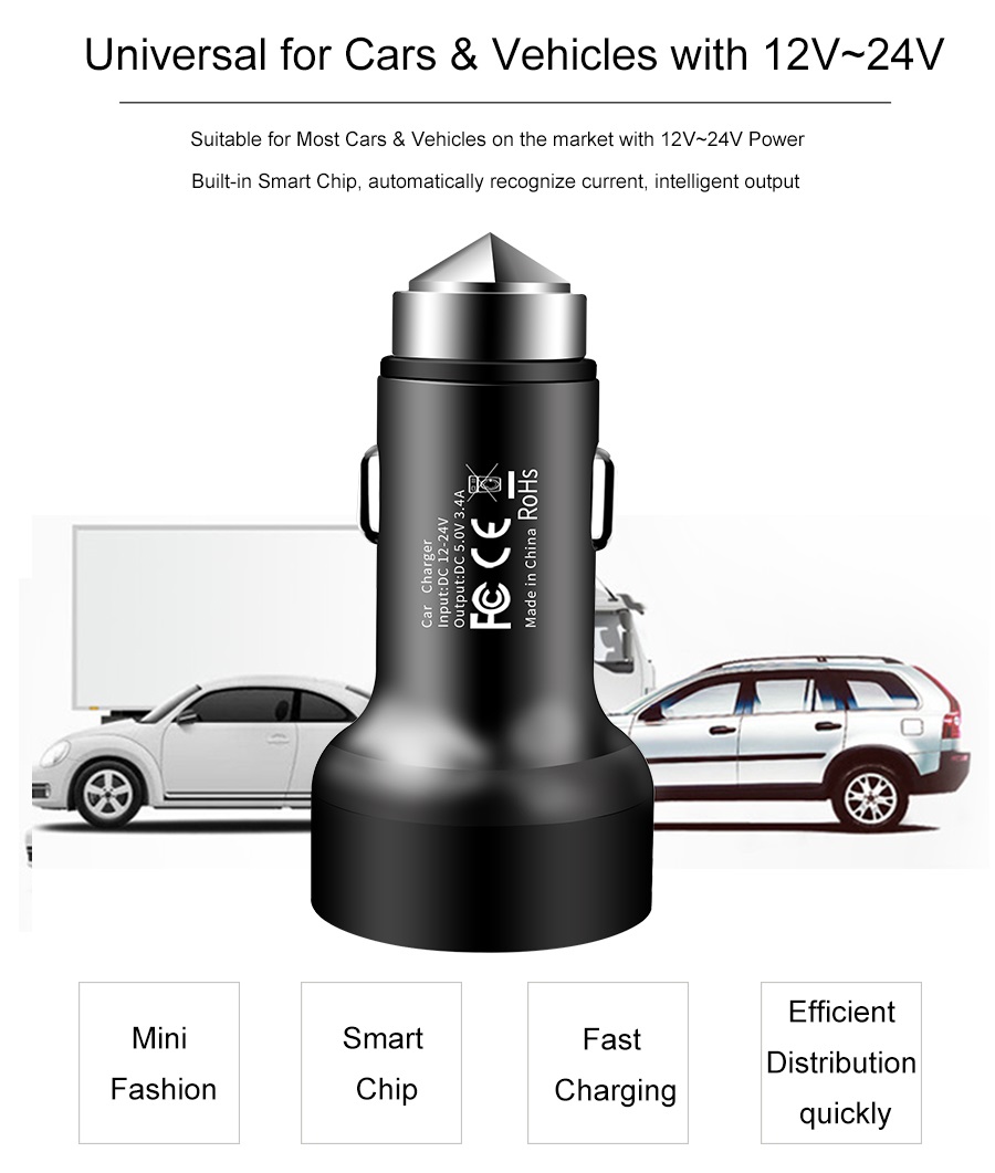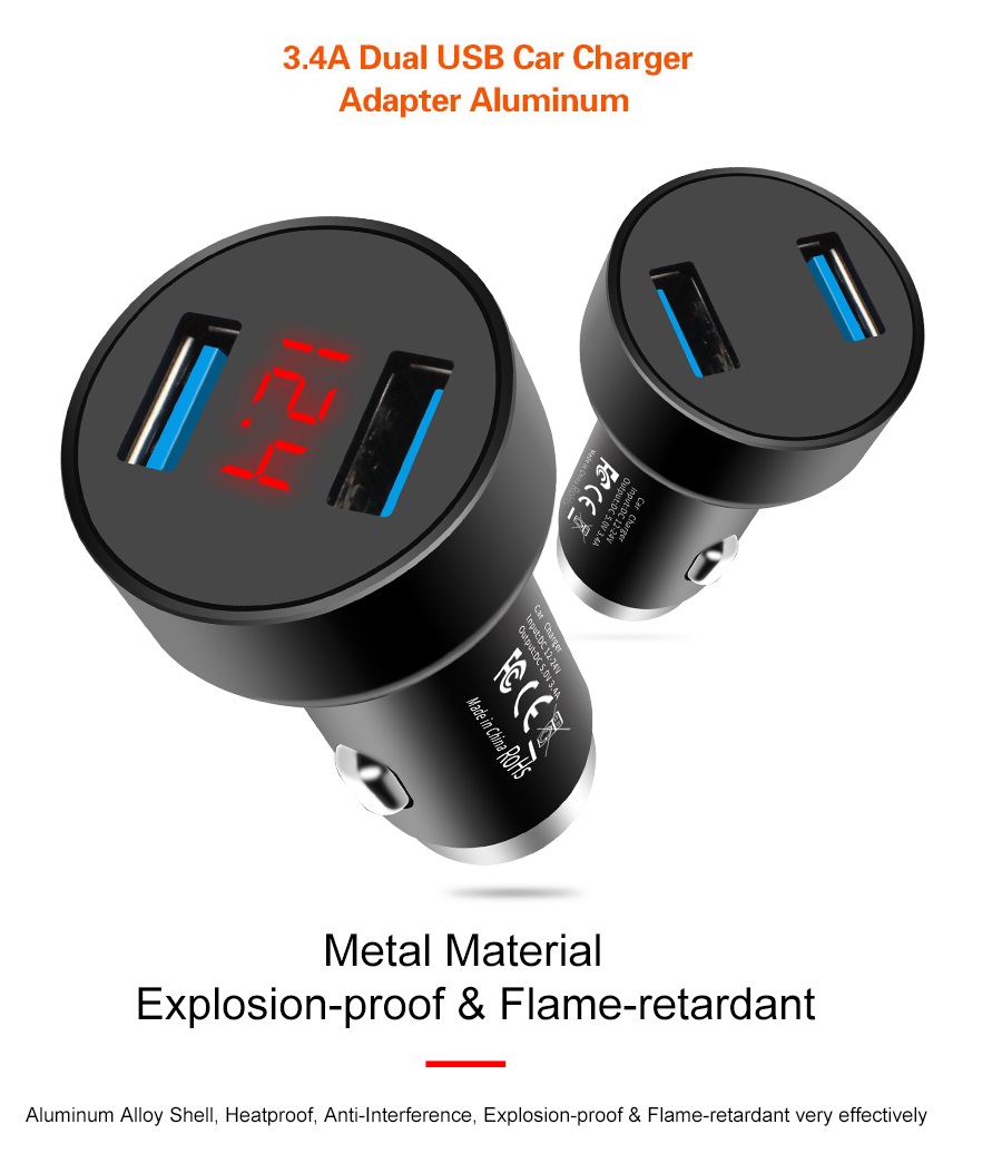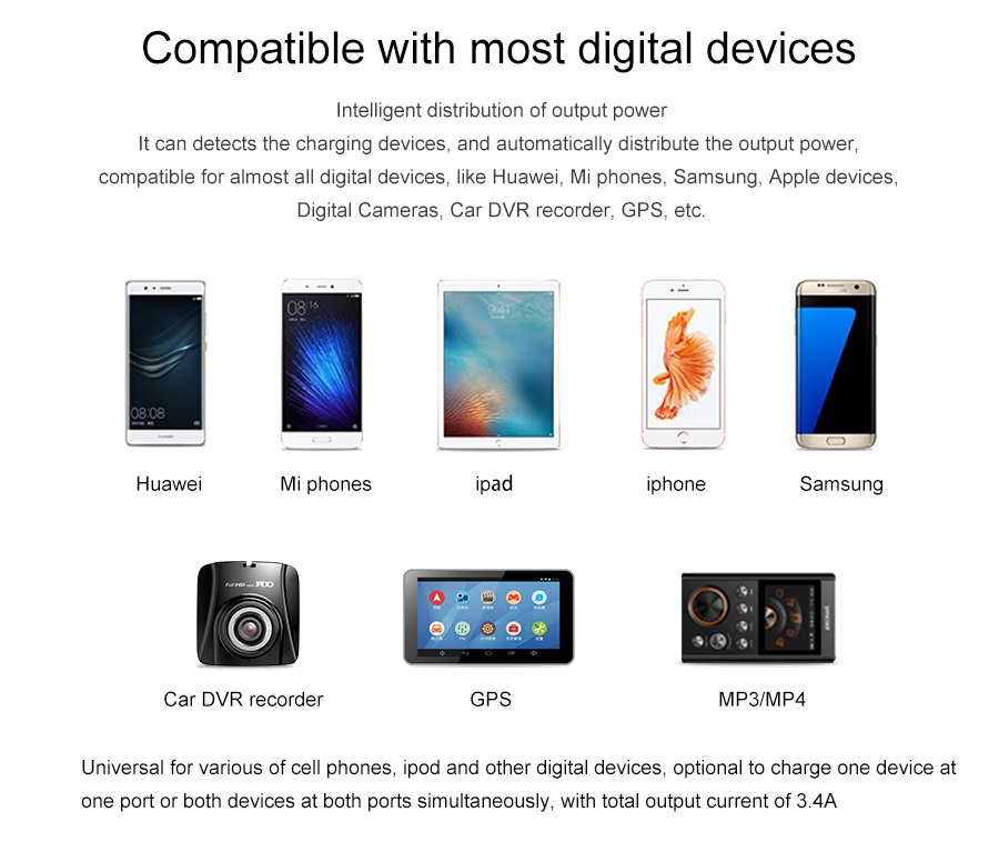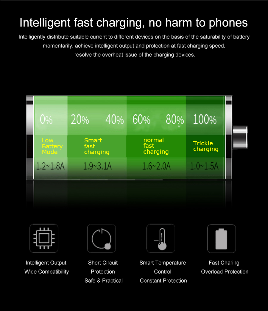 Saída de corrente super alta de 3.4A (não é Qualcomm QC), com distribuição inteligente baseada em diferentes dispositivos, ajustando momentaneamente a saída com base na saturação da bateria, carregando o seu dispositivo em alta velocidade de forma segura.