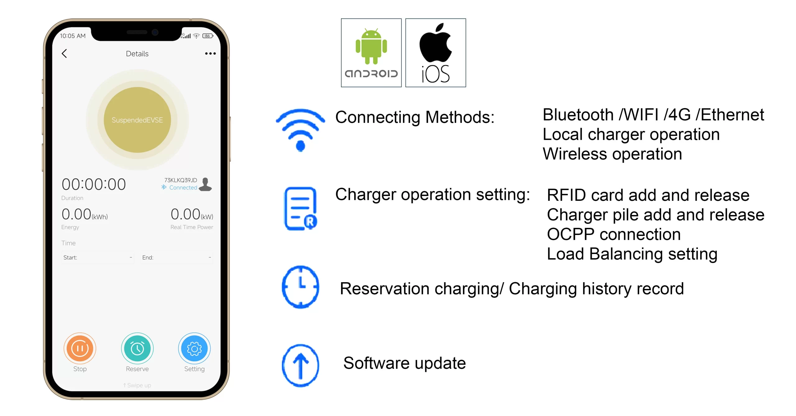 Múltiplas formas de controlo: Pode usar a APP ou os botões no carregador para controlar a carga. Consegue cancelar facilmente a conexão do aplicativo e reiniciar o carregador através da barra de menu.