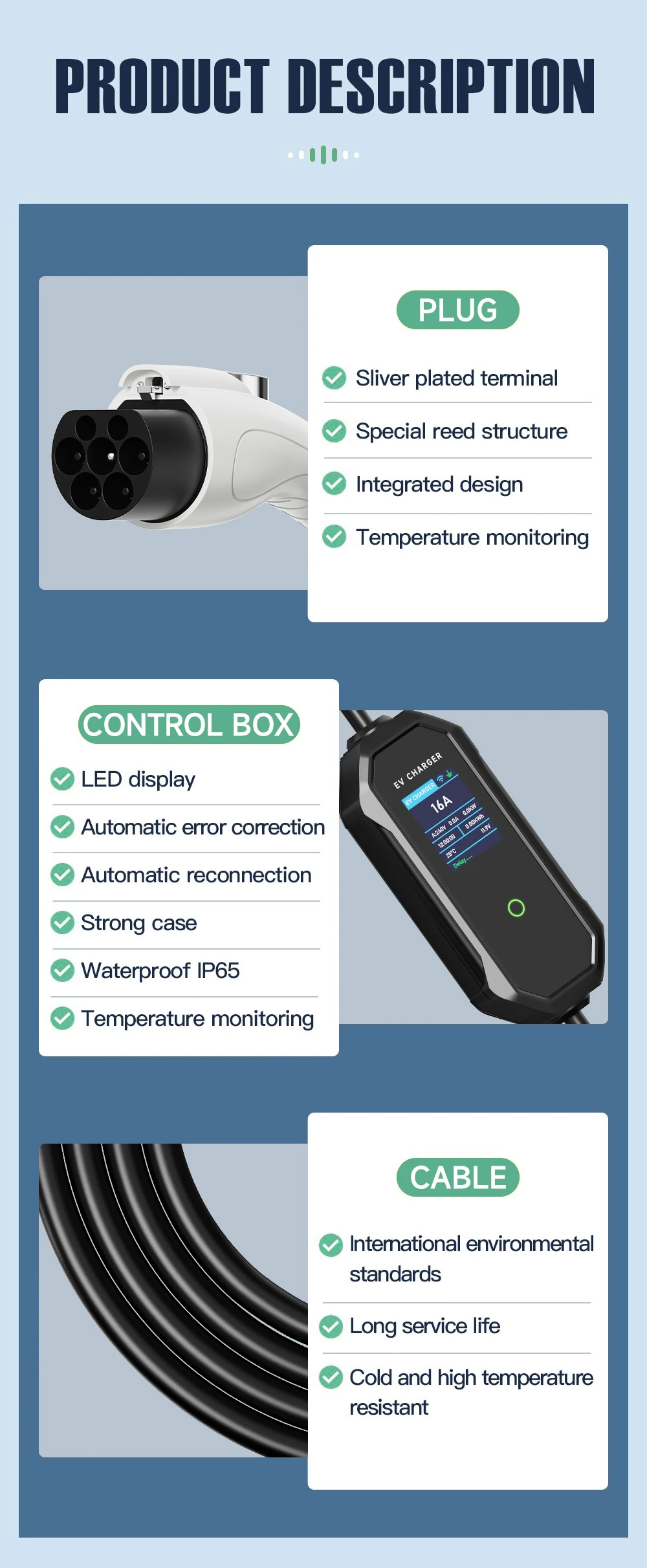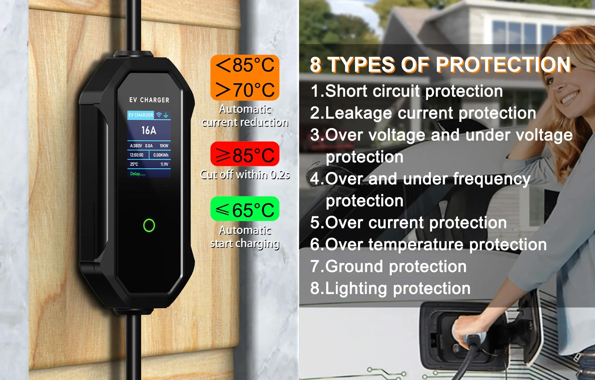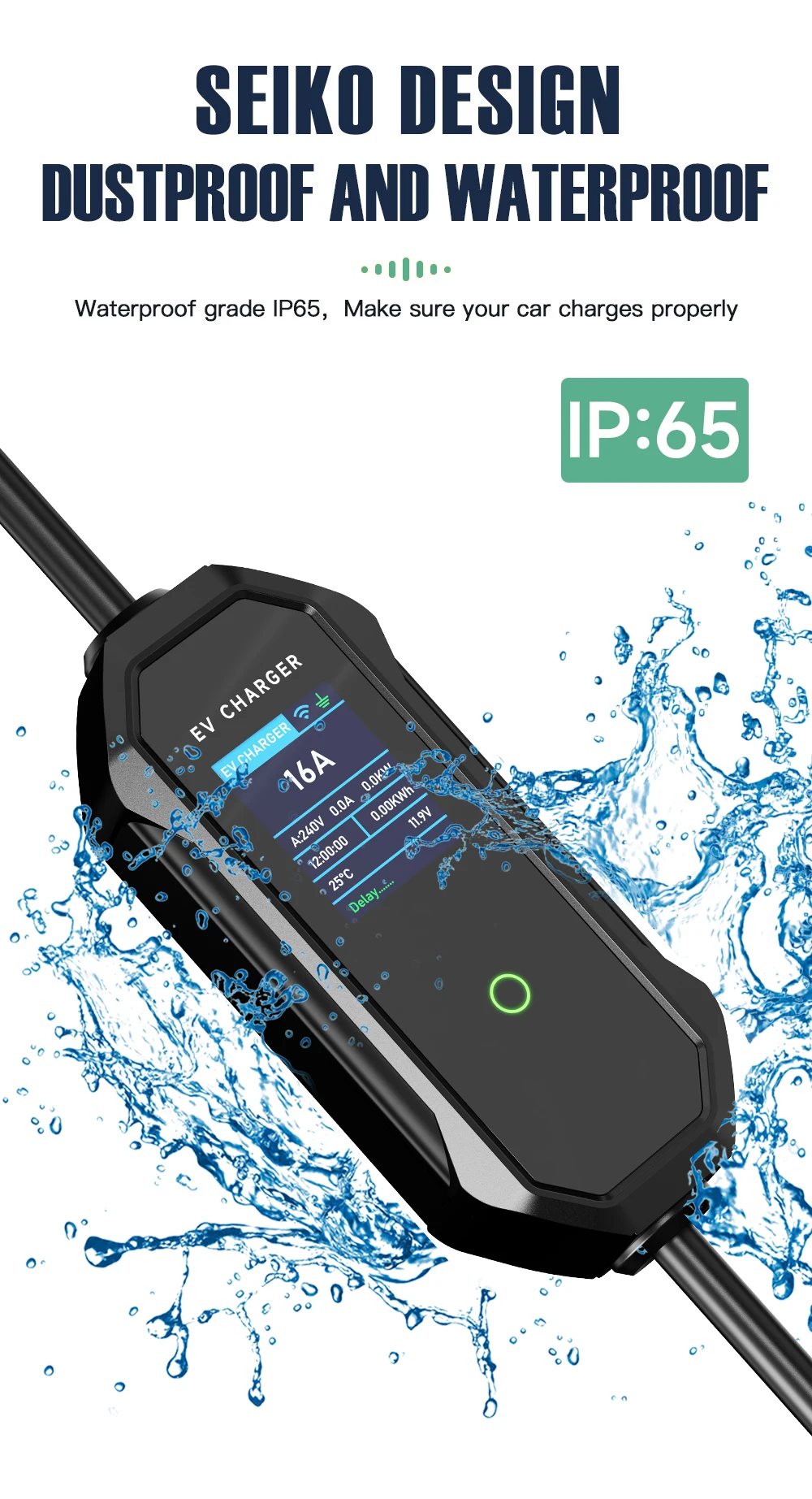 A segurança é uma prioridade absoluta para nós quando se trata de carregar veículos elétricos. O nosso carregador EV foi projetado com vários sistemas de proteção, como à prova de raios, proteção contra vazamentos (Tipo A DC 6mA), sobretensão, proteção contra sobreaquecimento, proteção contra sobrecorrente, proteção contra queda e muito mais. O cabo é feito de materiais TPE resistentes e de alta qualidade e o conector possui proteção IP65 à prova d’água e à prova de poeira para tornar este carregador doméstico EV mais seguro e confiável.
