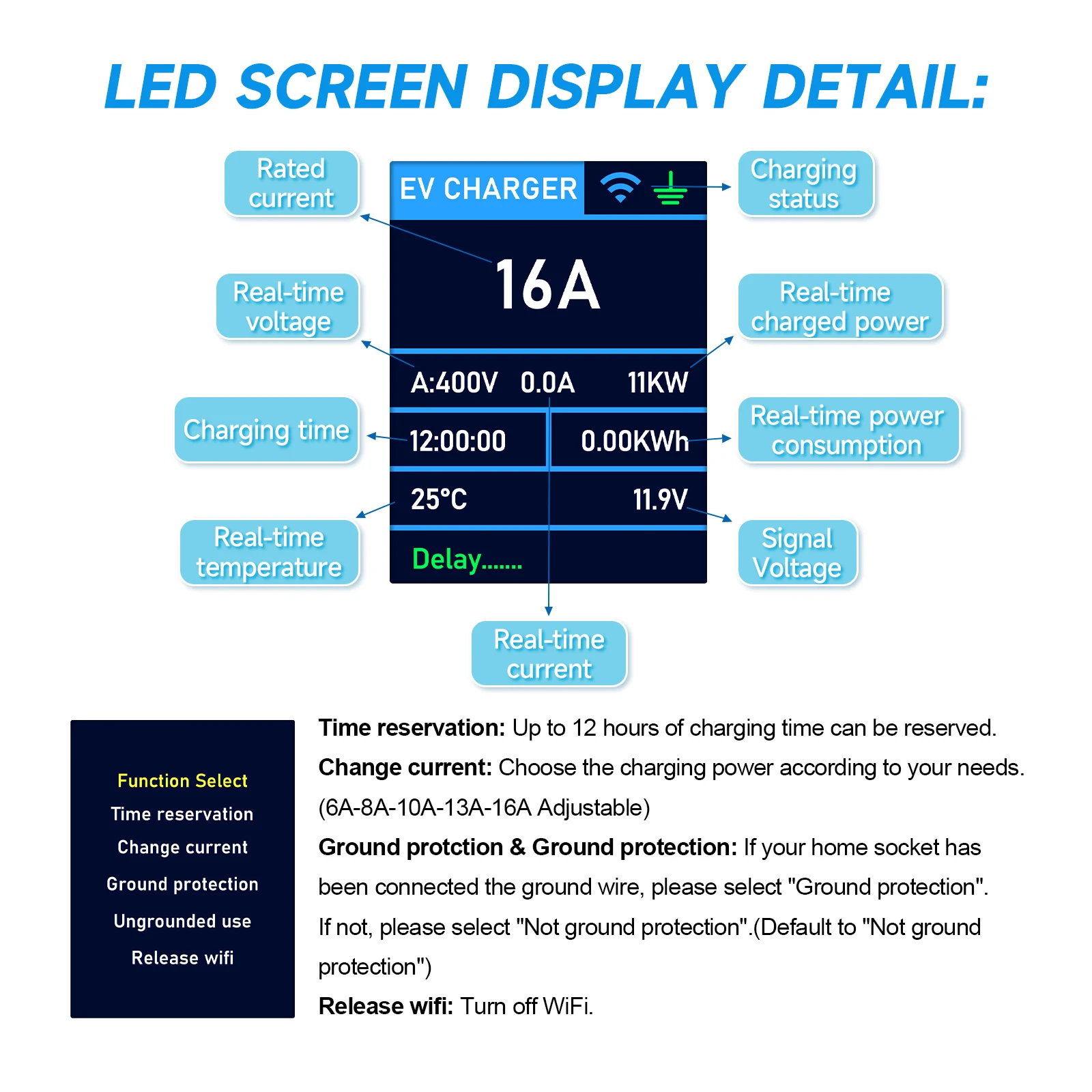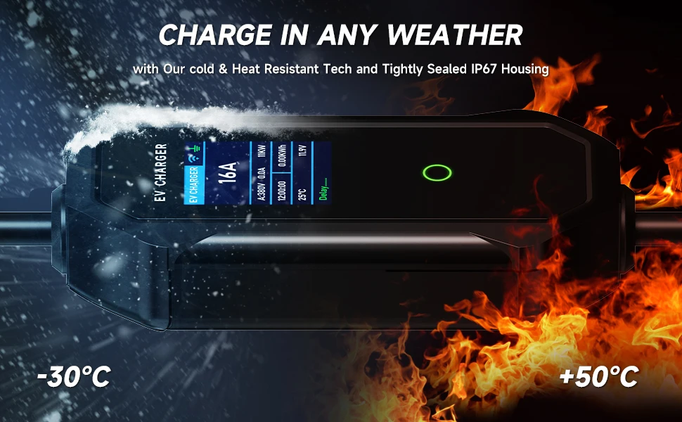 APP inteligente integrado, que permite que seus veículos sejam carregados durante o período de pico, definindo o tempo de carregamento, economizando dinheiro nas contas de luz. Permite ajustar a faixa de corrente de carregamento de 6A a 16A, notificação de totalmente carregado ou rastrear o status de carregamento.