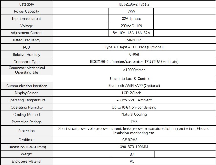 Este carregador EV é baseado em uma tensão de 240V e corrente ajustável de 6A/8A/10A/13A/16A/20A/24A/32A, para atingir uma potência de saída máxima de até 7KW, Tornando o carregamento do EV mais rápido