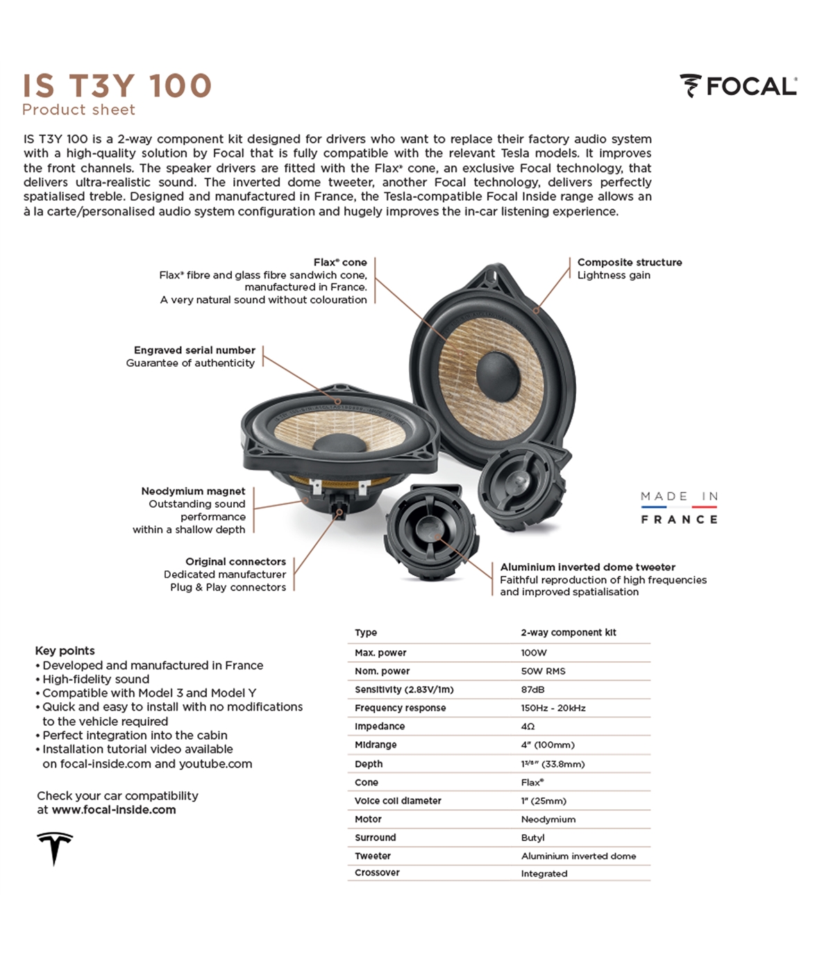 O kit de duas vias IS T3Y 100 apresenta o cone sanduíche Flax, feito de fibra de linho e fabricado na França. Esta tecnologia exclusiva da Focal reproduz um som puro, natural e ultra-realista