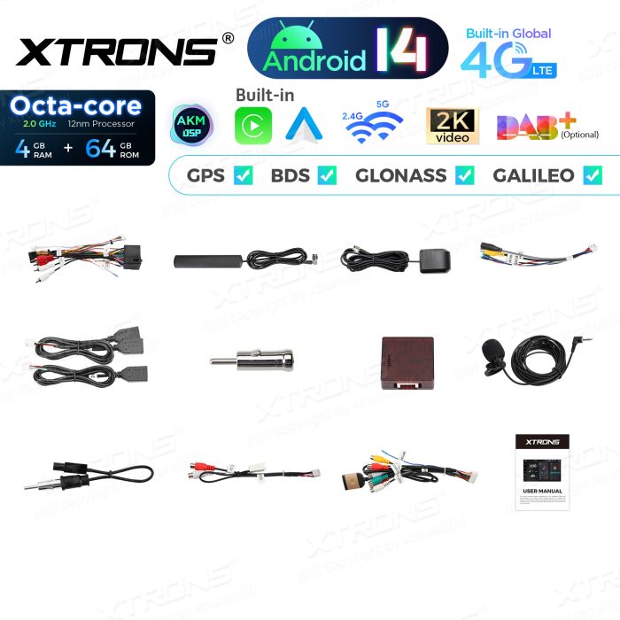 - Acessórios extra (não incluídos): OBD, câmera, DVR, DAB+, TPMS, etc.