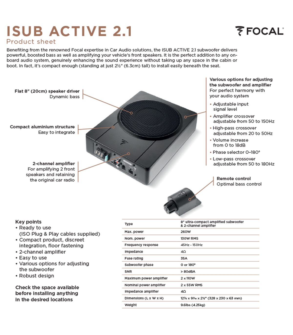 Medindo 6,3 cm de altura, o Focal ISUB ACTIVE 2.1 permite ser instalado de forma discreta, seja debaixo de um assento ou na bagageira.