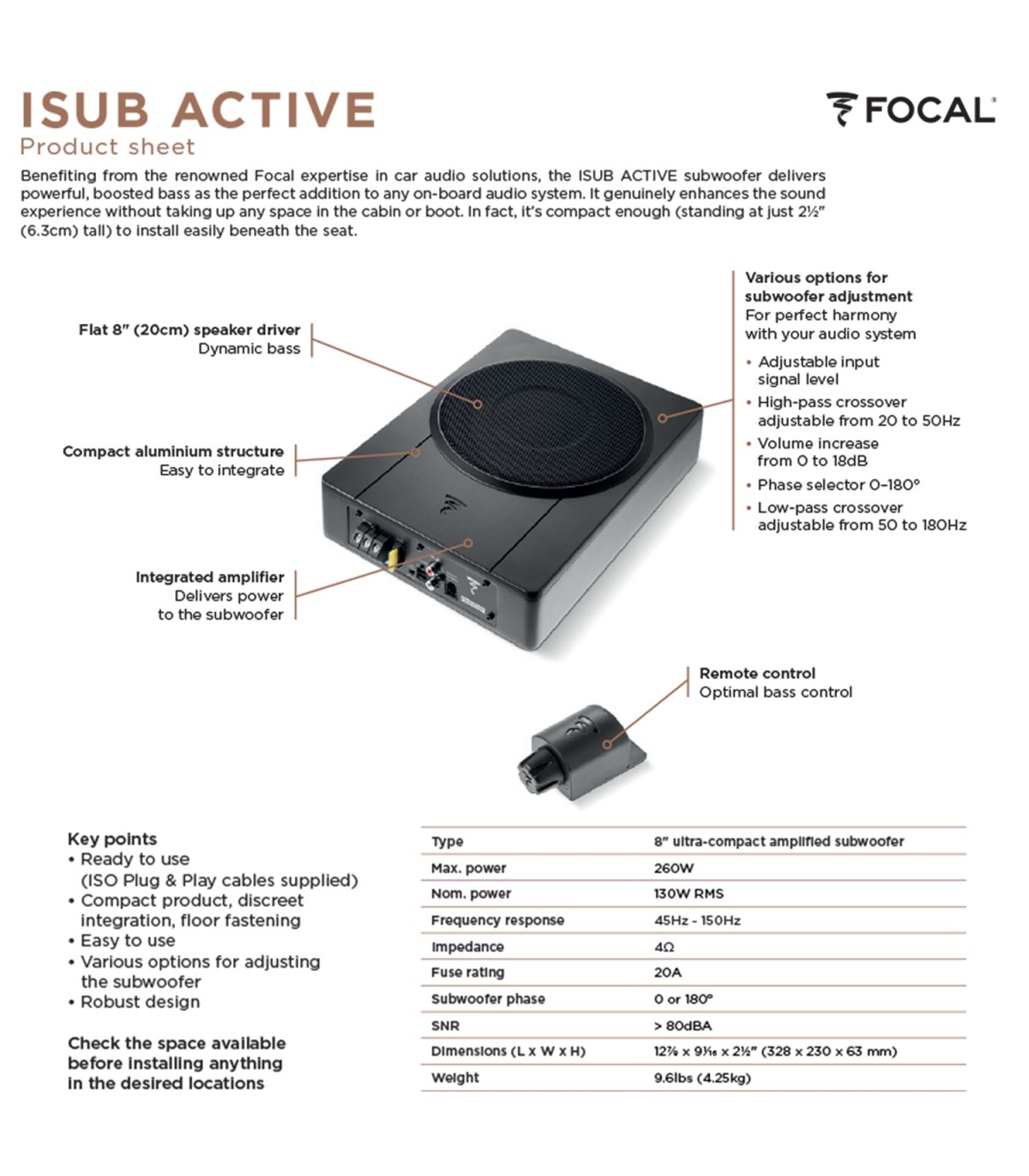 Medindo 6,3 cm de altura, o Focal ISUB ACTIVE permite ser instalado de forma discreta, seja debaixo de um assento ou na bagageira.
