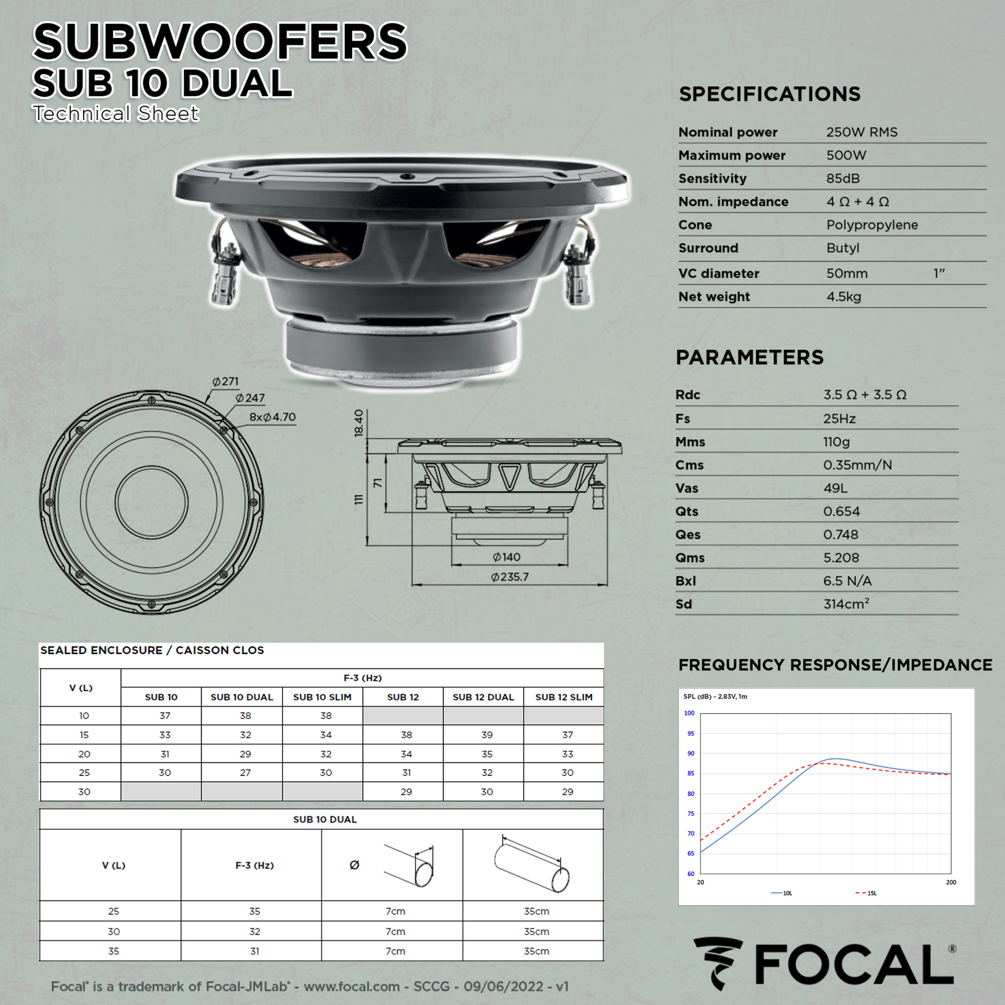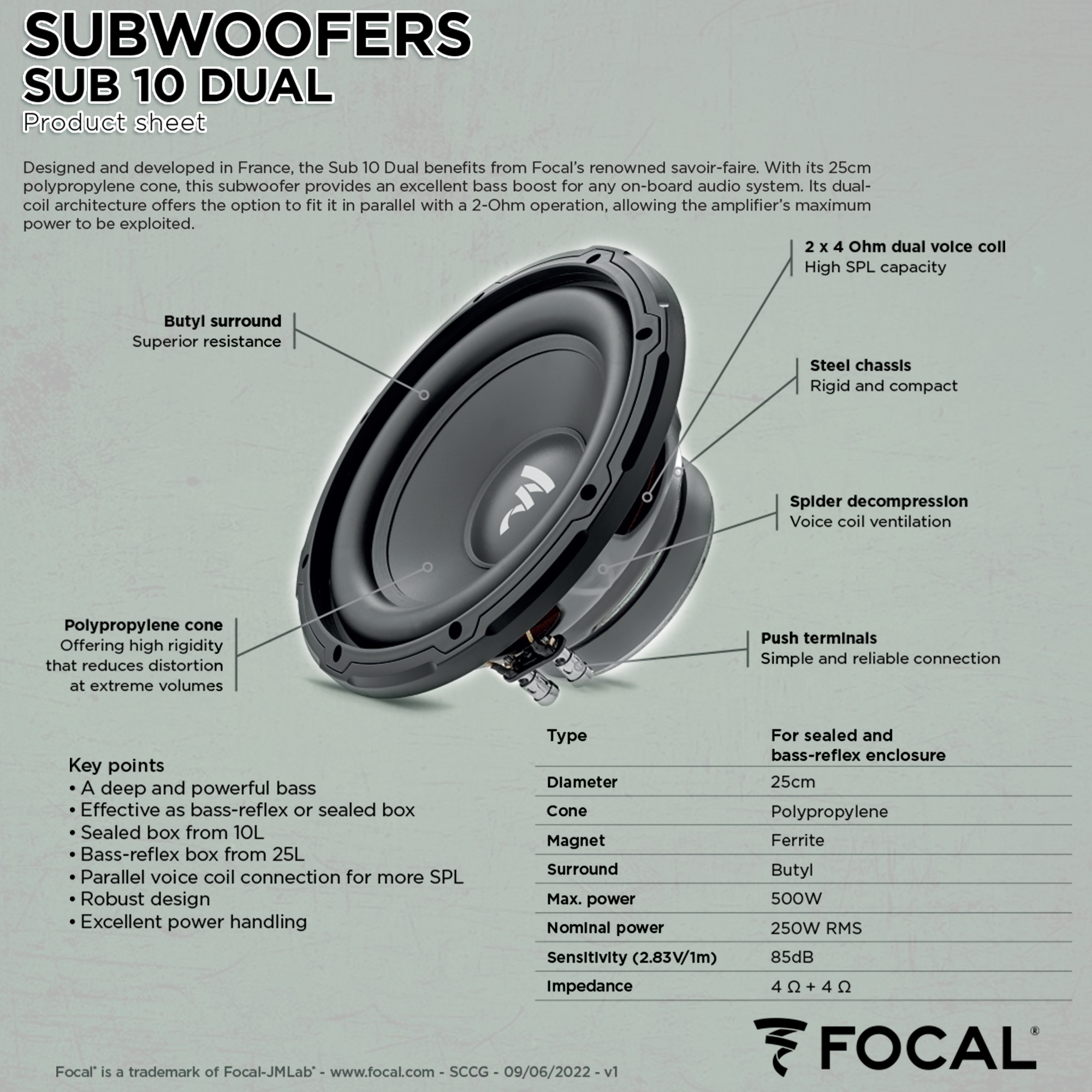 Focal Sub 10 Dual – Subwoofer 10″ (25cm), dupla bobine 4Ohm + 4Ohm
