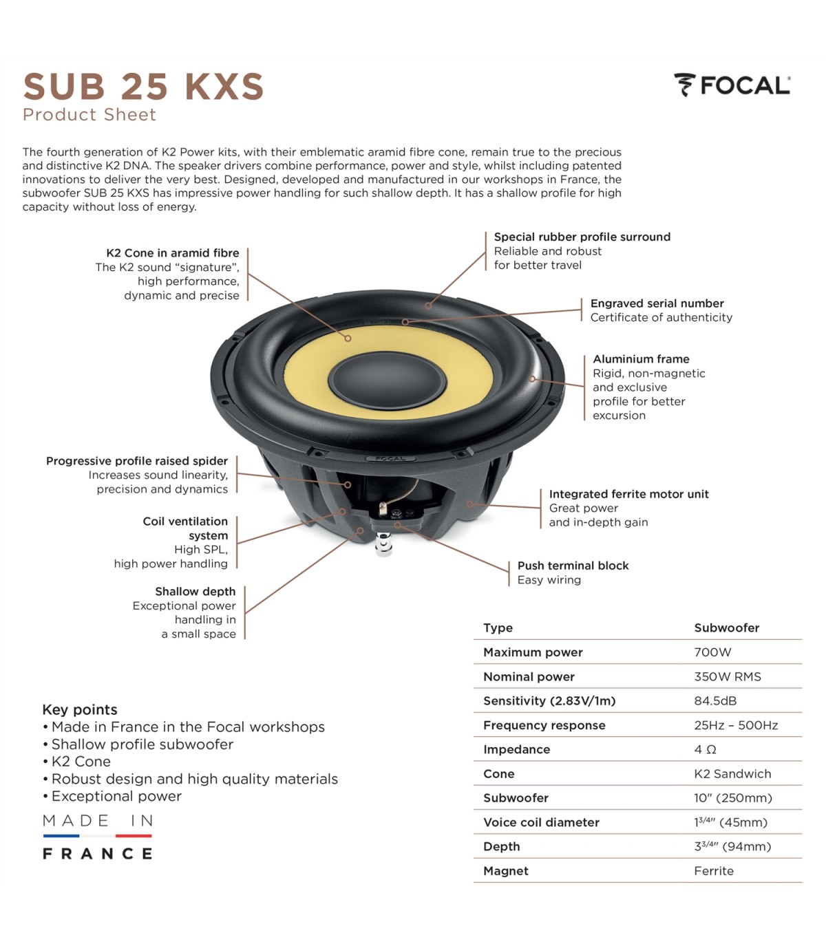 Como todos os kits K2 Power, o SUB 25 KXS apresenta o cone em fibra de aramida K2 (kevlar). Este tipo de cone nasceu em 1986 e foi aplicado em altifalantes para automóveis em 1992. O cone sanduíche K2 é uma inovação exclusiva da Focal, imediatamente reconhecível pela sua icônica cor amarela e pelo som perfeito com que consegue reproduzir as tuas músicas.