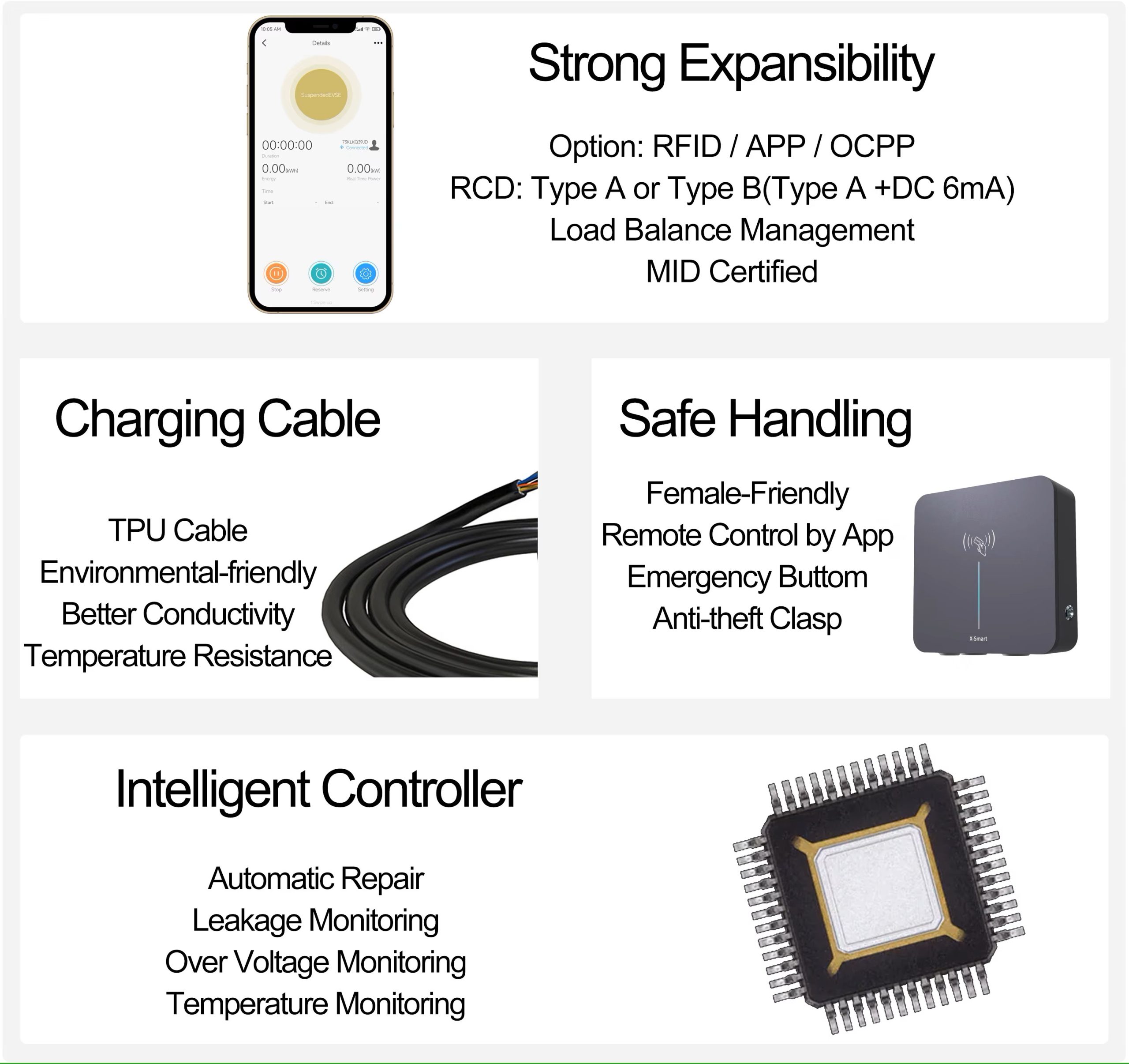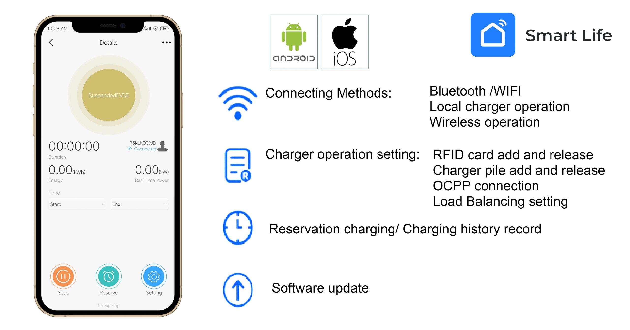 – Desbloqueio de carregamento por cartão RFID e APP