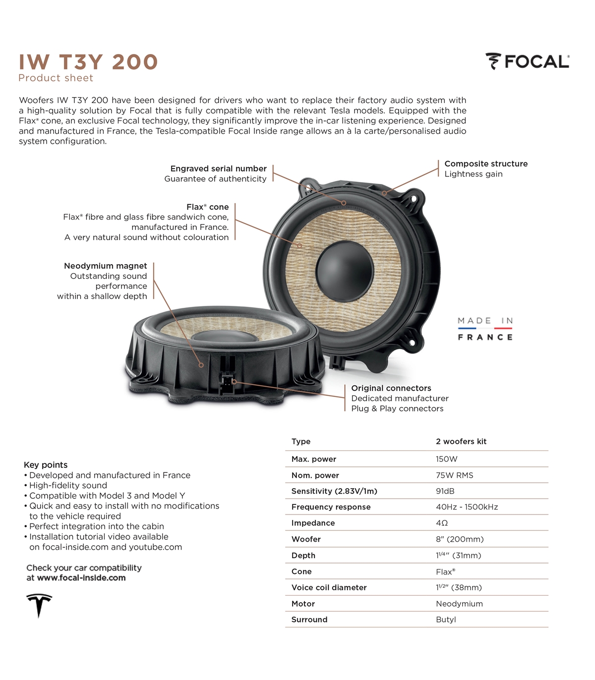 Desenhado especificamente para o Model 3 e o Model Y do fabricante de automóveis Tesla®, o kit de woofers IW T3Y 200 é uma solução de upgrade hi-fi do sistema de som, rápida e fácil de instalar, sem qualquer modificação no veículo.