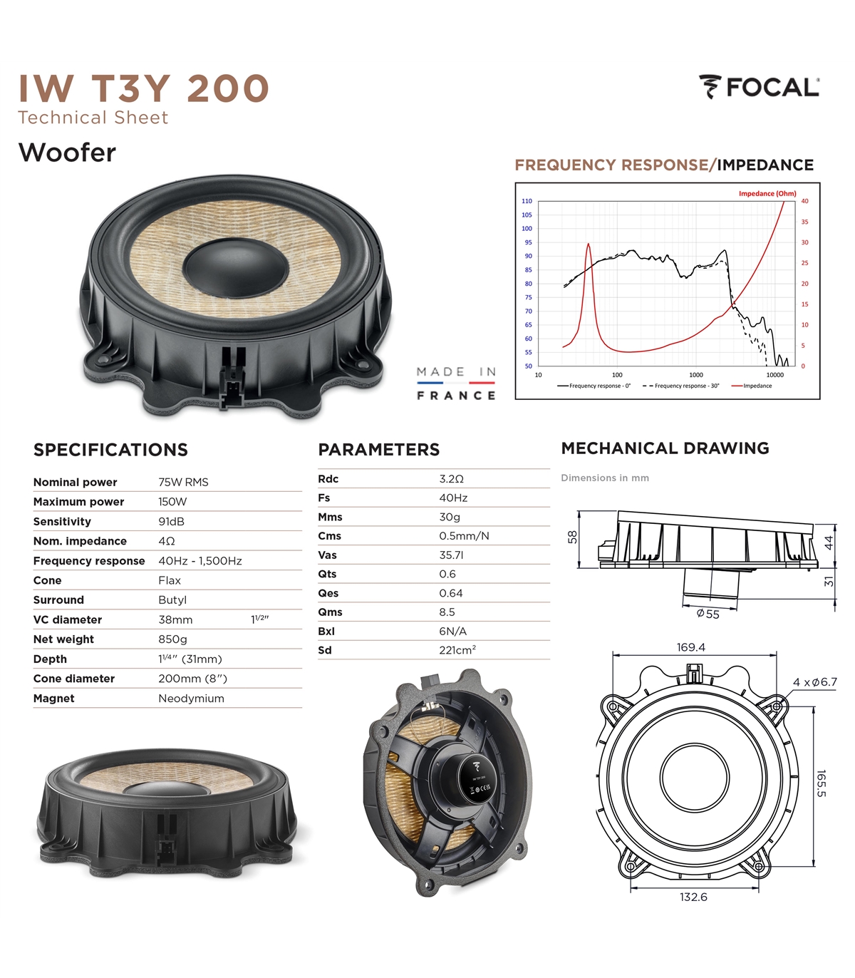 O kit de woofers IW T3Y 200 apresenta o cone sanduíche Flax, feito de fibra de linho e fabricado na França. Esta tecnologia exclusiva da Focal reproduz um som puro, natural e ultra-realista